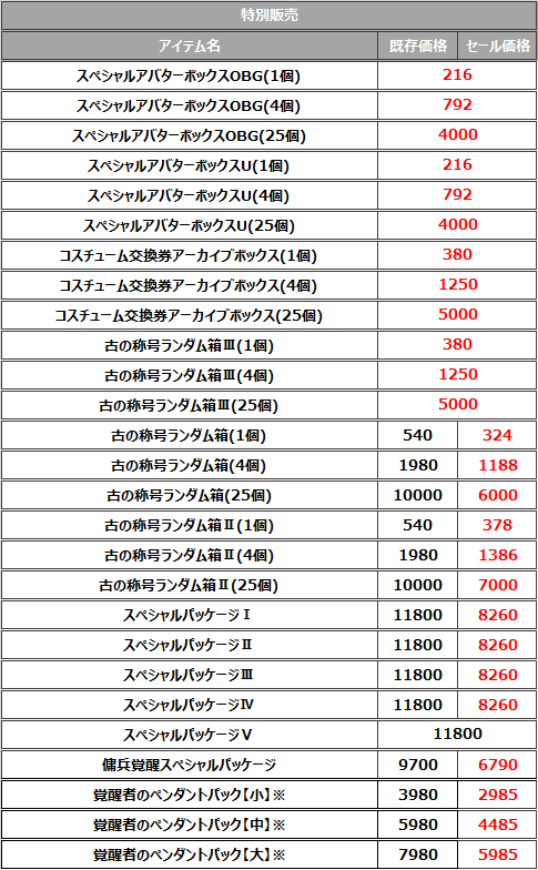 ※「覚醒者のペンダントパック」はそれぞれ月刊で2個の購入制限があります。