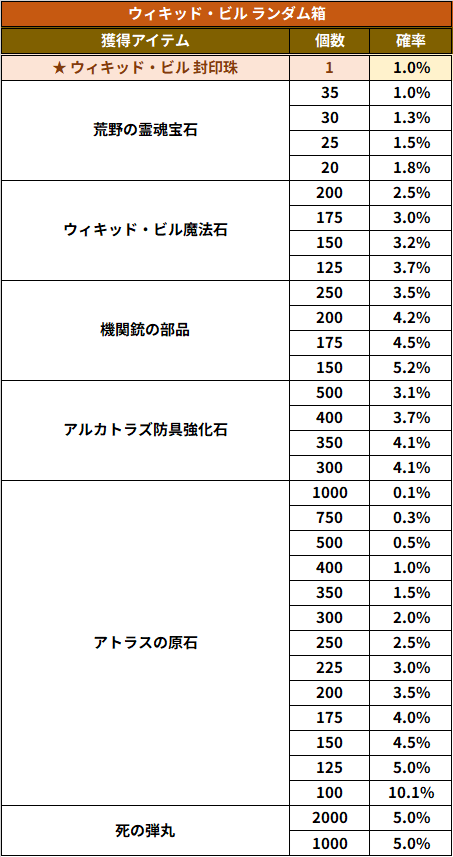 「ウィキッド・ビル ランダム箱」は一定回数開封時に特定アイテムを確実に獲得することの出来る、