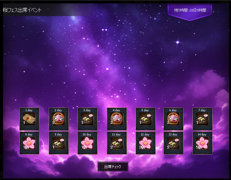 イベント期間終了まで14日出席チェックすることですべてのボーナスを獲得できます。