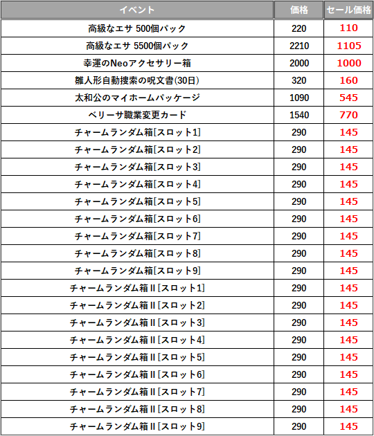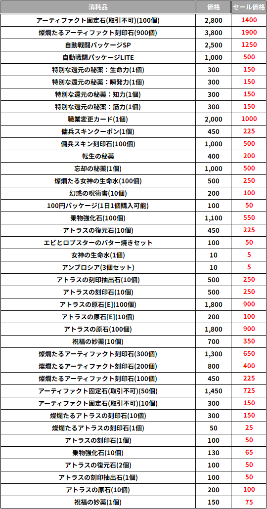 ※下記のリストはウェブページのアイテムモールとはセール率が異なります。