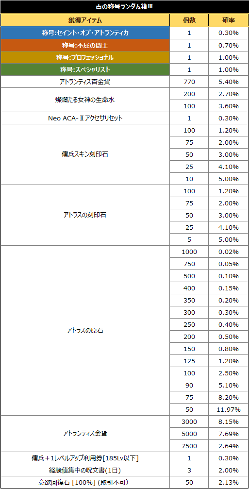 ■ 「古の称号ランダム箱Ⅲ」の構成品・確率情報は以下になります。
