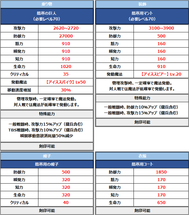 新規乗り物 「酷寒の巨人」、新規装飾「酷寒用マント」、