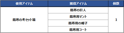 ■「酷寒の冬セット箱」(帽子・衣服・乗り物・装飾)の各能力値情報