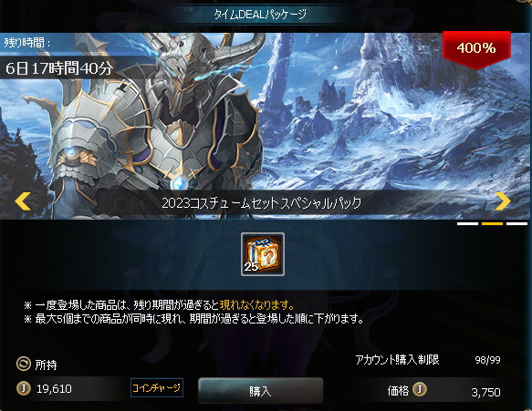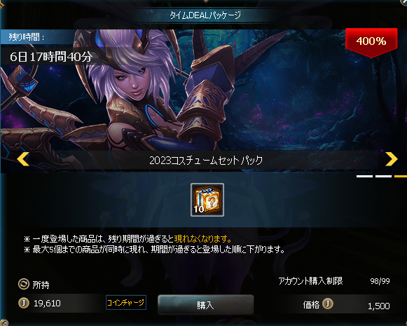 「確定獲得形式ランダムボックス」10個をアイテムモールより安く購入できるタイムDEALと、
